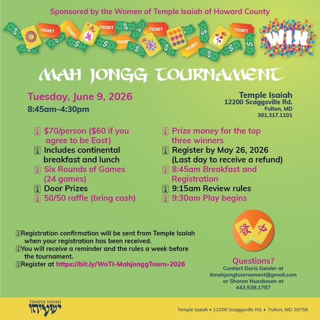 Tuesday, June 9, 2026,8:45 AM-4:30 PM. Temple Isaiah Mah Jongg Tournament sponsored by The Women of Temple Isaiah. This event will take place at Temple Isaiah, 12200 Scaggsville Road, Fulton, Md. The cost is $70 per person/$60 if you agree to be East. Please contact: Doris Geisler timahjongtournament@gmail.com or Sharon Nussbaum 443-538-1787. Registration link: